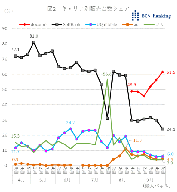 4月はSoftBankが6割超を占め、優勢を保っていた。しかし、UQ mobileのシェア上昇やSIMフリー対応のNECプラットフォームズ「Aterm HT100LN」の瞬間的な販売増により、SoftBank優位の状況が揺らいできた。8/27発売の「home 5G HR01」をきっかけに、docomoは48.9%のシェアを獲得して首位になった。その後もdocomoはシェアを伸ばし、直近の9月第5週には61.5%に達した。
