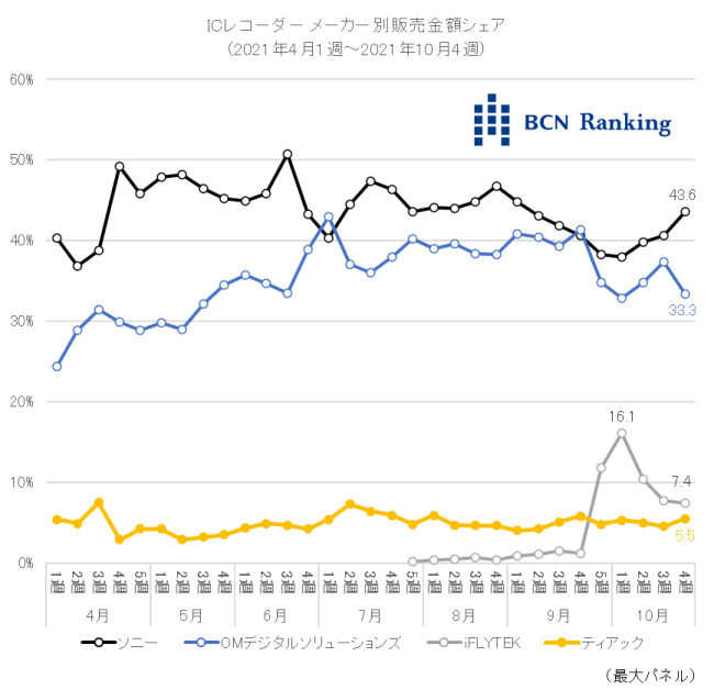 自動文字起こし機能付きICレコーダーのメーカーで、現在BCNランキングに登場しているのはiFLYTEKとソースネクストの2社。なかでも、この数週間で売り上げを伸ばしているのはiFLYTEKだ。2021年10月1週、ICレコーダー全体のメーカー別販売金額シェアではソニー、OMデジタルソリューションズ(旧オリンパス)に次いで、16.1%を獲得した。その後、シェアはやや低下したものの10月4週時点までTOP3をキープしている。