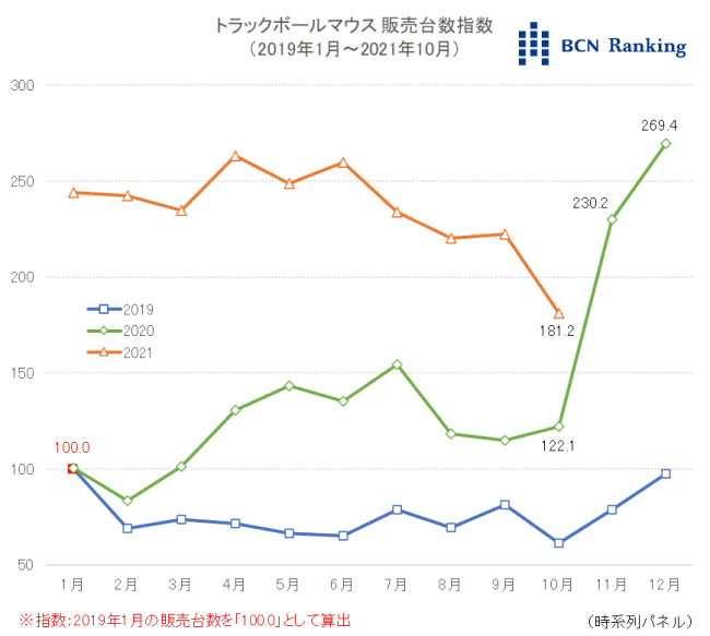トラックボールの販売台数が急増したのは2020年11月。19年1月の販売台数を100とした時の指数が、それまでの「100.0」前後から、一気に「230.2」まで伸びた。指数を押し上げたのはロジクールの新製品「ERGO M575 Wireless Trackball Mouse」。10年に発売した「M570」の後継モデルで、トラックボール派にとって待望の新機種だった。「ERGO M575」発売のインパクトは大きく、翌12月には「269.4」を記録。21年に入ってからも好調は続き、指数は200前後で推移している。