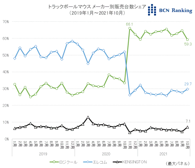 現在、トラックボール市場はエレコム、ロジクール、KENSINGTON(ケンジントン)の3社が、販売台数のおよそ96%を占めている。20年10月までは、エレコムが5割前後で市場をリードしていた。しかし、「ERGO M575」の登場でシェアは一気に逆転。21年10月時点ではロジクールが59.3%でトップを走っている。