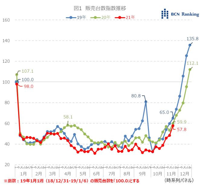 直近3年のインクジェットプリンター市場を2019年1月1週(18/12/31-19/1/6)の販売台数を「100.0」として指数化すると、例年10月から年始にかけて需要が高まっていることが分かる。19年は10月の消費増税前の駆け込み需要によって、9月4週(19/9/23-9/29)に80.8に達し、10月に入ると反動減による落ち込みはあったが、年末商戦に向け指数は急速に回復した。20年は4月1週(20/3/30-4/5)まで前年と同様の動向だったが、コロナの感染拡大による在宅勤務やリモート授業の普及・拡大により、インクジェットプリンターの需要が増えて前年を上回ったものの、年末は19年の水準には及ばなかった。消費増税やコロナ禍といった特需で需要が先食され、21年はほぼ前年を下回って推移。11月3週(21/11/15-11/21)の指数は57.8にとどまり、市場規模は縮小している。