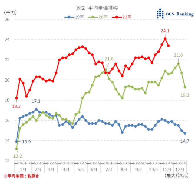 19年の平均単価は一年を通して1万5000円前後で推移していた。しかし、20年の5月以降、平均単価は徐々に上がり始め、6月3週(20/6/15-6/21)には一時的に2万円を超えた。その後2万円を下回る水準にまで落ち着いたが、21年3月4週(21/3/22-3/28)以降は恒常的に2万円を超えて推移、11月2週(21/11/8-11/14)には直近3年で最も高い2万4100円に達した。19年の最安値だった1月1週と比較すると、この3年で2倍近くまで値上がりしていることが分かった。