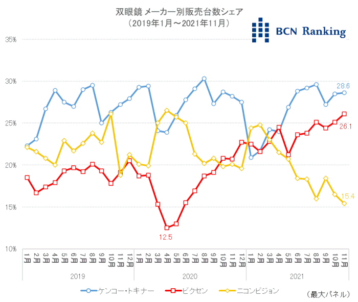 21年11月現在、双眼鏡市場はケンコー・トキナーが28.6%の販売台数シェアでトップを走っている。平均単価が4千円前後と、手ごろな価格でシェアを稼いでいる。2位のビクセンは昨年一時的にシェアが12.5%まで下落したものの、26.1%まで回復し首位に迫る。ニコンビジョンは15.4%で上位2社とやや差をつけられているが、平均単価3万円以上の「モナーク」シリーズなど単価の高い製品が好調。金額シェアでみると26.7%で2位のニコンは、29.2%で1位のビクセンとトップを争っている。