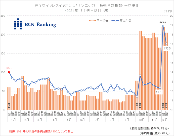 2021年1月1週のパナソニックのTWS販売台数を「100」とした指数は今年1年を通じて50~80前後で推移していたが、12月1週に「222.9」まで急上昇した。同社が12月1日から展開している「Technicsオンラインミーツキャンペーン」の効果と考えられる。今年4月発売の「EAH-AZ70W-S」と10月発売の新製品「EAH-AZ60」「EAH-AZ40」のいずれかの購入者を、男性ダンス&ボーカルユニット、BE:FIRSTの限定オンライントークイベントに招待するというもの。BE:FIRSTファンの購入が集中し、一時的に販売台数が増加したとみられる。12月2週も勢いを維持しており、指数は「175.5」を記録した。