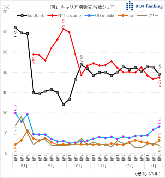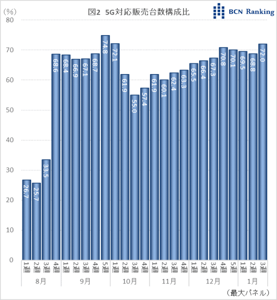次にホームルーターの5G対応製品が占める販売台数構成比を見ていく。21年8月時点で既にUQ mobileとauが5G対応製品を発売しており、同月1週の構成比は3割程だった。docomoの「home 5G」発売をきっかけに構成比は6割台後半に跳ね上がる。その後一時的に7割を超えるが、10月2週以降docomoのシェア下落とともに5G対応の構成比は5割台まで後退した。しかし、SoftBankの「Airターミナル5」発売をきっかけに構成比は再び増加傾向に転じ、12月4週に70.8%と約3か月ぶりに7割台に回復した。その後は7割前後を維持し、直近22年1月3週の構成比は72.0%だった。
