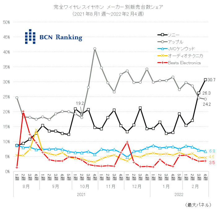 ソニーの販売台数シェアが急増したのは22年2月3週。前週よりも9.2ポイント増の26.3%を記録して、21年10月2週以来、19週ぶりにアップルを逆転した。シェア増の要因は穴が開いた独特な形状が特徴の新製品「LinkBuds」。2月3週は発売前にも関わらず、予約分のみで機種別販売台数ランキング4位にランクインした。発売週の2月4週には更に販売台数が増加。同ランキングで首位に躍り出ている。これによってソニーのシェアは30.7%に達し、過去3年で初めて3割を超えた。