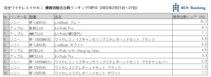 完全ワイヤレスイヤホン(TWS)市場でソニーのシェアが2022年2月4週に3割を超えた。新製品「LinkBuds」が貢献している。家電量販店・ネットショップの実売データを集計する「BCNランキング」から明らかになった。