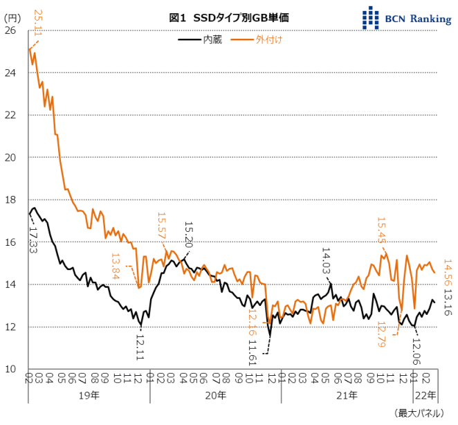 SSDの1GBあたりの単価(GB単価)をタイプ別に比較してみた。2022年に入ってから外付け・内蔵ともにGB単価は上昇に転じていることが、家電量販店・ネットショップの実売データを集計する「BCNランキング」で明らかとなった。
