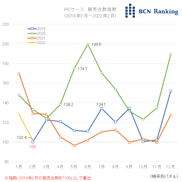 PCケース市場はコロナ禍による巣ごもり需要で2020年に販売台数が大きく増加したが、21年2月以降は減少に転じた。22年2月は19年2月並みに落ち着いている。家電量販店・ネットショップの実売データを集計する「BCNランキング」で過去3年の販売台数指数と各メーカーの販売台数シェアを振り返る。