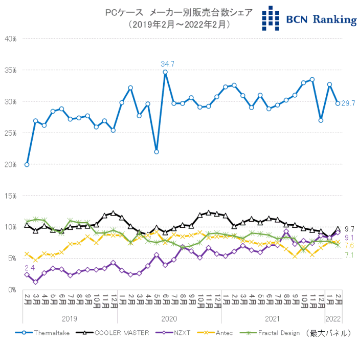 19年2月から現在までPCケース市場はThermaltakeの独走が続いている。メーカー別販売台数シェアは常に2~3割前後をキープ。20年6月には34.7%を記録するなど、他社に大きく差をつけている。一方、2位以下のシェア争いは混戦状態だ。22年2月時点はCOOLER MASTERが9.7%で他社を一歩リードしているが、NZXTが背後に迫っている。NZXTは19年2月時点で2.4%にすぎなかったが、過去3年で着実にシェアを拡大。21年2月は9.1%を記録した。4番手以降にはAntecが7.6%、Fractal Designが7.1%でつけており、いずれも僅差でCOOLER MASTERを追っている。