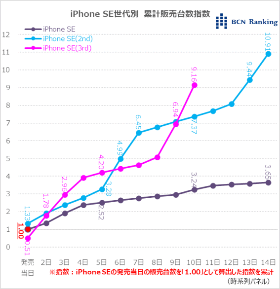 これまで3世代発売されたiPhone SEの初動を家電量販店・ネットショップの実売データを集計する「BCNランキング」で比較した。