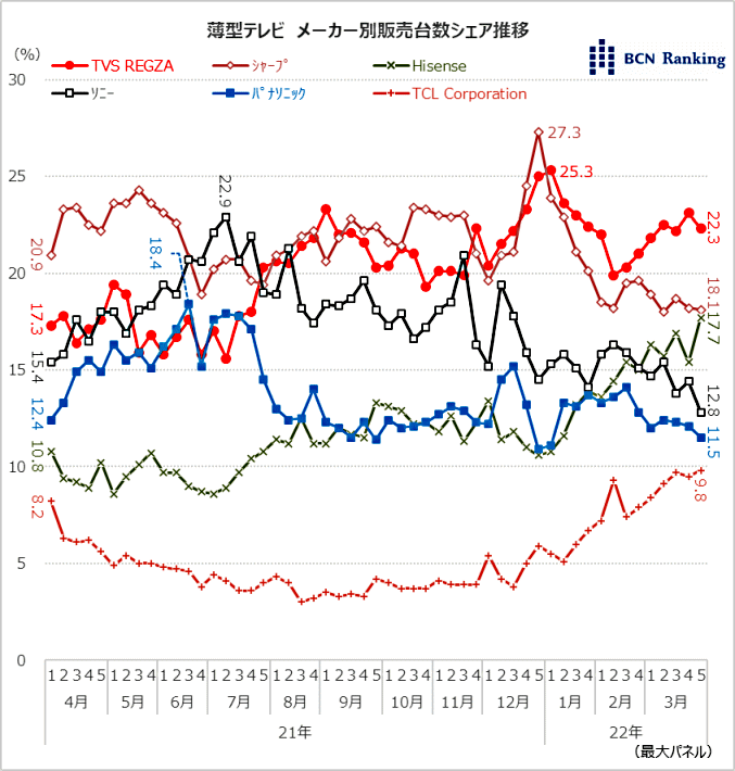 2020年から翌21年に延期された東京五輪の開催に向けたキャンペーンをパナソニックとソニーが実施。パナソニックは21年6月3週、ソニーは同年7月2週にかけてシェアを伸ばした。しかし、東京五輪の開会前に両社のシェアはピークに達した後、徐々に落とし始めた。その隙をついて、TVS REGZAが21年7月3週以降シェアを伸ばし始め、一時はシャープを抜き首位に立つ。だが、シャープはすぐに首位を取り戻し、年末まで両社との首位争いは繰り返された。21年最終週にシャープが27.3%を記録するも、その後シェアは急落。TVS REGZAが22年1月1週以降、13週連続で首位を保っている。