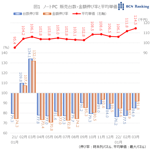 ノートPC市場の販売台数と販売金額の前年同月比(伸び率)を算出したところ、2021年4月以降12か月連続で前年を下回る水準で推移している。しかし、平均単価は21年10月以降、上昇傾向で推移していることが家電量販店・ネットショップの実売データを集計する「BCNランキング」で明らかとなった。
