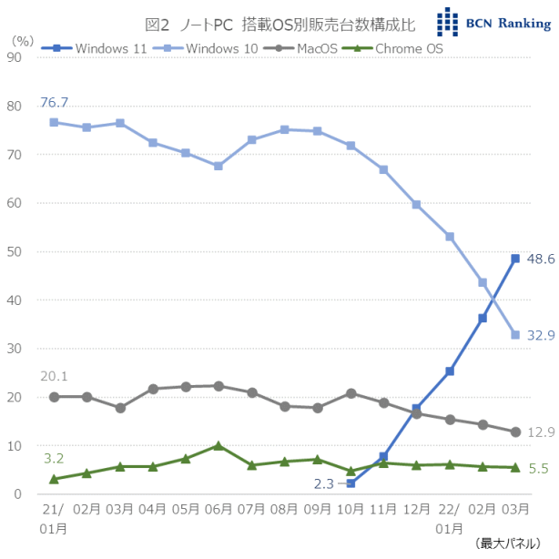 21年10月からWindows 11搭載マシンが発売になり、単価上昇の要因になっている。また、同月にアップルの「MacBook Pro Liquid Retina XDRディスプレイモデル」の発売も単価上昇に寄与している。搭載OS別の販売台数構成比をみると、Windows 11搭載の構成比は発売以降右肩上がりで推移、発売後6か月で48.6%に達した。しかし、一世代前のWindows 10搭載ノートPC登場時(15年9月)の6か月後にあたる16年2月は6割を超えていたことを考えると、Windows 11搭載ノートPCの出足は鈍いと言えそうだ。