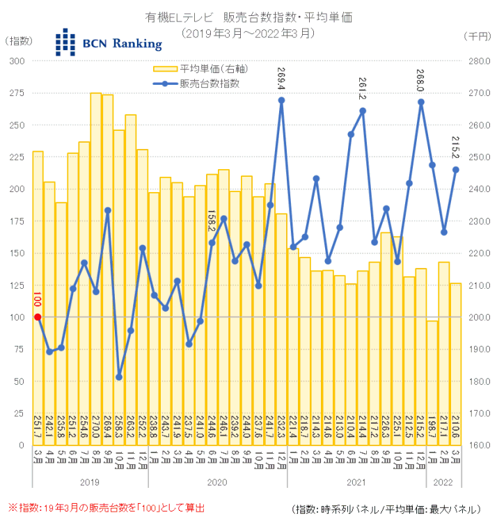 有機ELテレビ市場が伸びている。2022年3月の販売台数は、3年前と比べ2倍以上に拡大した。ラインアップの拡充や平均単価の下落が主な要因だ。家電量販店・ネットショップの実売データを集計する「BCNランキング」で明らかになった。