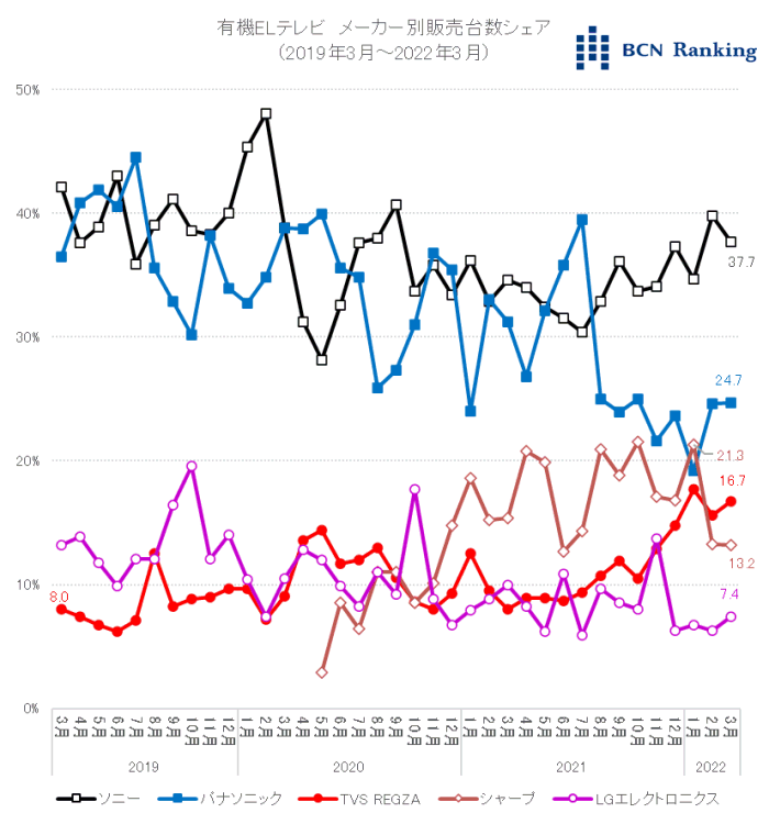 メーカーシェアの争いはソニーの独走態勢になりつつある。ソニーとパナソニックは長らく販売台数シェアで首位争いを繰り広げてきたが、21年8月以降はソニーが8か月連続で1位を堅持。22年3月は37.7%と4割水準までシェアを上げてきた。一方、上位5社で最も遅く20年5月に市場参入したシャープ。小型の48型を投入したことや価格の安さで順調にシェアを伸ばしてきた。22年1月には21.3%で初めて2位に浮上している。19年3月に8.0%と1ケタ台だったTVS REGZAは21年8月以降、安定的に10%台を維持。22年3月は16.7%を獲得し、シャープを上回った。LGエレクトロニクスは3年を通じて10%前後を行き来しており、直近は7.4%で各社の後塵を拝している状況だ。