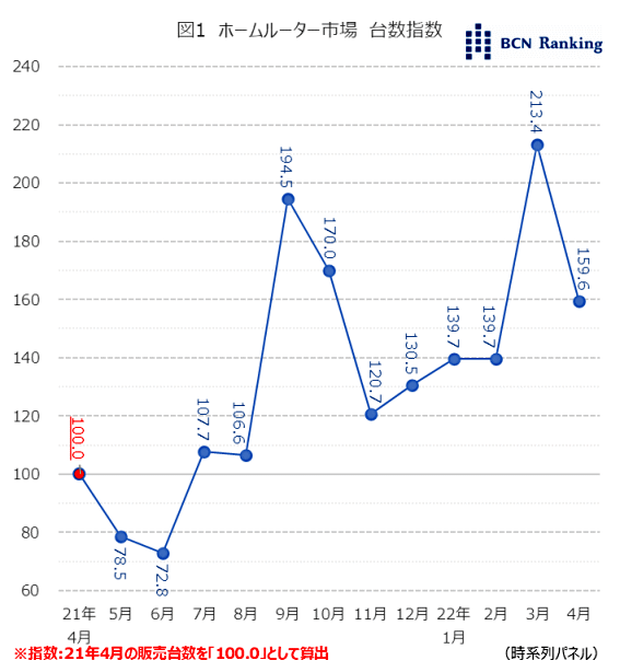 2021年4月のホームルーターの販売台数を「100.0」として台数指数を算出した。21年9月の指数が194.5に達したのは、docomoから8月末に発売になった5G対応の「home 5G HR01」が大きく寄与している。しかし供給が追いつかず、高い水準を維持することはできなかった。同年10月にはSoftBankも5G対応の「Airターミナル5」発売したことで市場は再び活気を取り戻し、右肩上がりで推移していく。年度末にあたる22年3月は、指数も一気に213.4まで跳ね上がった。翌4月は159.6と前月から50ポイント以上落ち込んだものの、市場規模は一年で1.5倍にまで膨れ上がった。