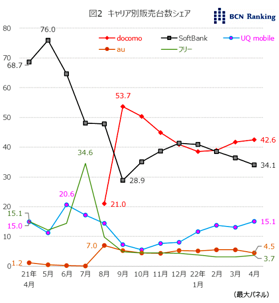 次にキャリアのシェアを算出したところ、SoftBank一人勝ちの市場だったが、「home 5G HR01」の発売をきっかけにdocomoが53.7%のシェアを獲得し、一気に勢力図を塗り替えた。SoftBankも「Airターミナル5」発売で巻き返し、docomoと首位争いを展開している。また、UQ mobileも22年1月以降、5G対応の「Speed Wi-Fi HOME 5G L11」の販売が増加、翌2月から新CMでホームルーターを大々的に取り上げたことで、シェアは徐々に上がっている。