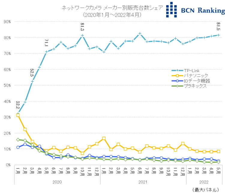 20年1月のネットワークカメラ販売台数を「100」とした指数は、「152.3」を記録した3月以降、右肩上がりに伸長。6月に「209.2」と初めて200を超え、10月には「334.4」と1年足らずの間に3倍以上の規模に達した。要因は中国のネットワーク機器メーカー、TP-LINKの新製品投入による急激な平均単価の下落だ。それ以前は、パナソニックやプラネックス、I・Oデータなどの1万円超えの製品が主流だった。しかしTP-LINKは6000円台の「KC100」や、4000円台の「Tapo C200」を投入。これによって平均単価は押し下げられ、2月の1万3200円をピークに、4月には9000円と1万円を下回った。さらに7月には7000円台、10月に6000円台に突入。20年10月以降も低価格のTP-LINK製品がけん引する形で指数は200~300前後で推移。直近の22年5月も「322.5」と高い指数を維持している。