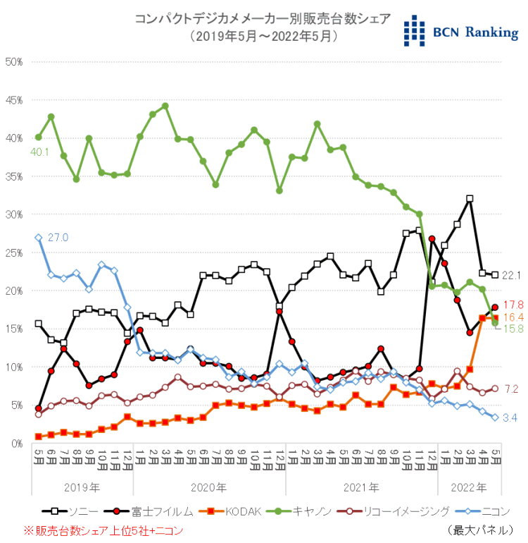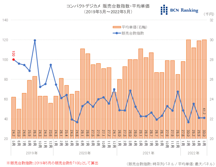 コンデジの平均単価は2019年5月から20年5月まで2万5000円前後で推移していたが、6月に2万9100円に急上昇。12月、一時的に2万5000円を下回ったものの、その後は2万6000円~2万9000円前後で推移した。22年2月には初めて3万円を超え、直近の5月でもほぼ3万円の水準を維持している。こうした単価上昇のきっかけをつくったのは20年6月にソニーが新発売した「VLOGCAM ZV-1」。動画撮影に特化した機能と、「VLOG」という新しい切り口が話題を呼んだ。10万円前後の価格ながら発売月から14か月連続して販売金額ランキングで1位を記録。コンデジでは久々の大ヒット商品になった。このほか、光学30倍ズームという強みを持つソニーの「Cyber-shot WX500」や、高い耐久性を備えたOMデジタルソリューションズの「OLYMPUS Tough TG-6」のような3万円以上の製品も上位にランクインし続けている。