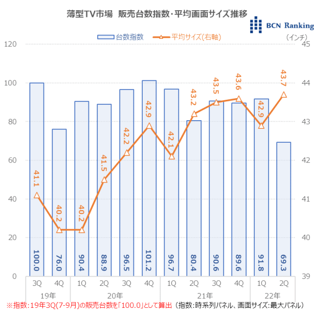 液晶テレビと有機ELテレビを合計した薄型TV市場の販売台数を指数したところ、市場は緩やかに縮小していた。また、平均画面サイズでは大画面化の進行が、家電量販店・ネットショップの実売データを集計する「BCNランキング」から明らかとなった。