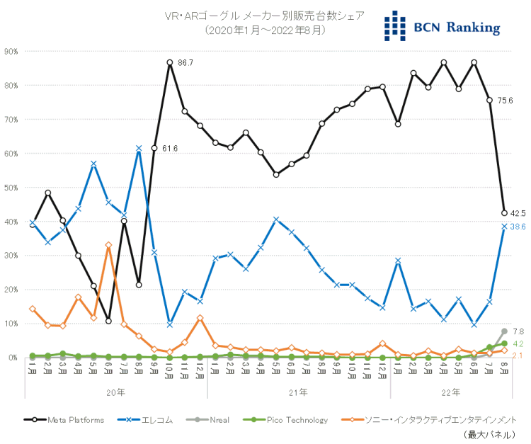 「VR・ARゴーグル」市場で、トップを走るMeta Platforms(Meta)が急ブレーキ。これまで8割前後あったシェアが2022年8月に4割程度まで急減した。家電量販店・ネットショップの実売データを集計する「BCNランキング」で明らかになった。