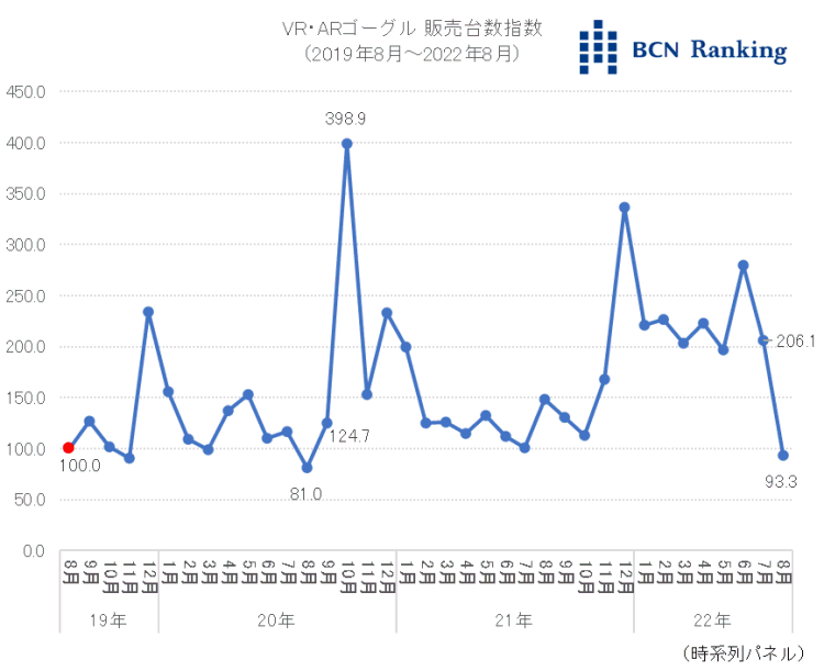 Metaの急ブレーキは市場全体にも大きな影響を与えた。19年8月の販売台数を100とした指数は「Meta Quest2」発売の20年10月に「398.9」と400近くまで急拡大。浮き沈みはあるものの、以降一度も100を下回らず、22年7月も「206.1」と2倍以上の規模を維持していた。しかし、8月は一転して「93.3」。3年前の水準を下回った。明らかにMetaの失速によるものだ。