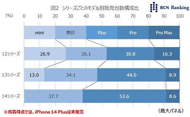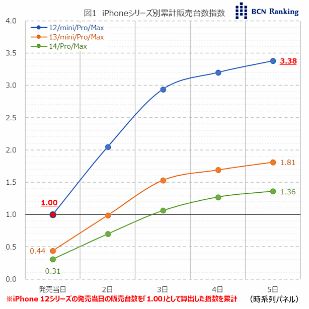 2022年9月16日にPlusを除くiPhone 14シリーズ(無印/Pro/Pro Max)が発売になった。そこで、12・13・14シリーズの初動を家電量販店・ネットショップの実売データを集計する「BCNランキング」で算出し、比較した。