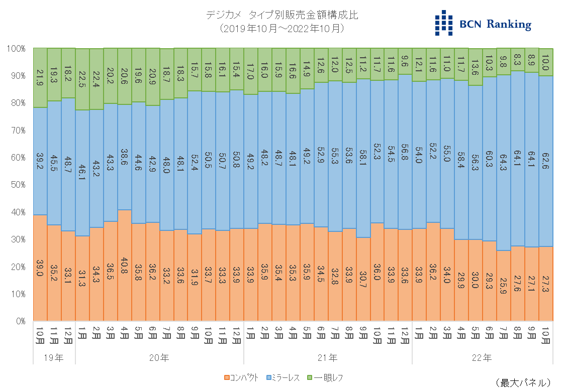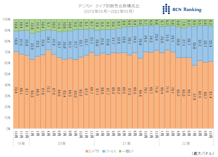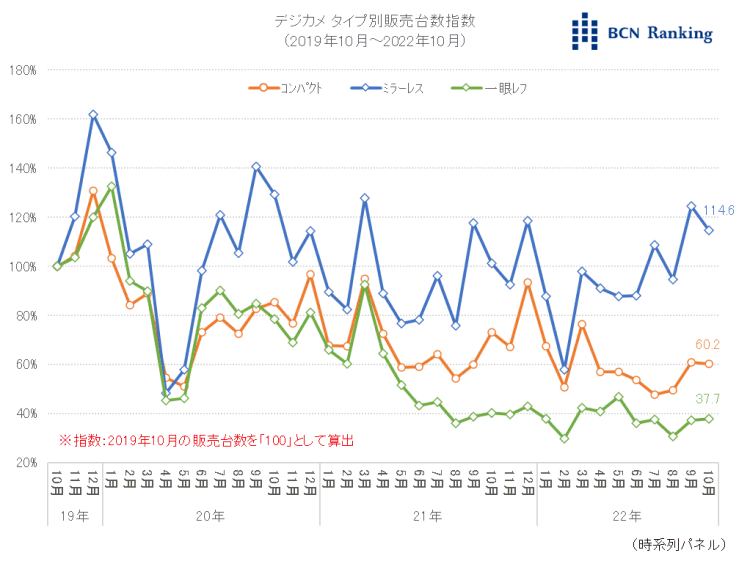 19年10月のミラーレス一眼全体の販売台数を「100」とした22年10月の指数は「114.6」。波はあるものの、一定の水準を維持している。一方、コンパクトデジカメの同期間での指数は「60.2」、一眼レフでは「37.7」。コンパクトデジカメと一眼レフの販売台数が急減していることも、ミラーレス一眼の構成比を押しあげる要因になっている。