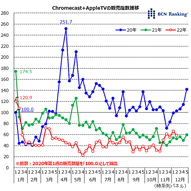 GoogleのChromecastとアップルのApple TVを合わせたストリーミングデバイスは、2020年のコロナ禍で在宅時間の増加に伴い販売数が大幅に増加した。翌21年は反動減で厳しい状況に陥ったが、22年11月に入り前年を上回る動きをみせた。家電量販店・ネットショップの実売データを集計する「BCNランキング」で20年1月第1週から22年12月第1週までの販売推移をみていく。