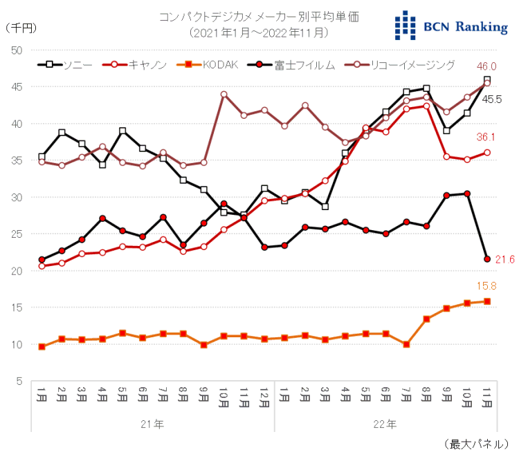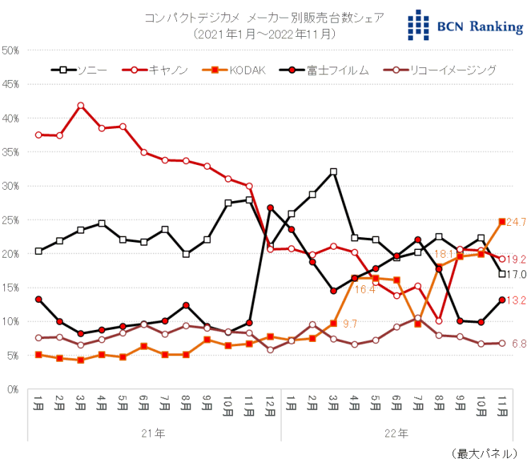 21年は5%前後で推移していたKODAKのシェアは、じわじわと増加していき、22年3月に9.7%まで上昇。4月は「PIXPRO FZ43」の販売台数が伸びたことに加え、ソニーの販売台数が急減した影響もあり、シェアは16.4%まで拡大した。7月は一旦後退したものの、8月は新製品「PIXPRO FZ55」の発売が奏功して18.1%まで伸長。11月には過去最高の24.7%を記録し、初めてメーカーシェアで首位を獲得した。