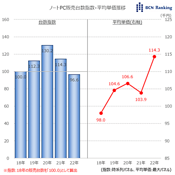 2022年のノートPC市場は前年を大きく下回った。18年以降、平均単価は年々上昇していたが、22年は前年から1万円超も上昇したことで、市場規模の縮小に結び付いたと言えそうだ。家電量販店・ネットショップの実売データを集計する「BCNランキング」からノートPC市場の過去5年間の動きをみていく。
