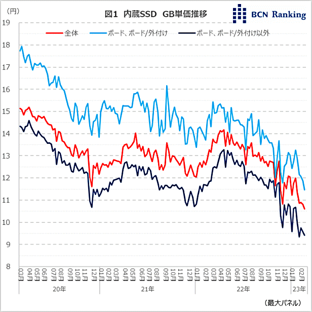 例年、内蔵SSD市場における1GBあたりの単価(GB単価)は、年末を底に年初から上昇に転ずる。しかし、GB単価は2023年に入っても今のところ上昇の兆しがみられず続落していることが、家電量販店・ネットショップの実売データを集計する「BCNランキング」で明らかとなった。