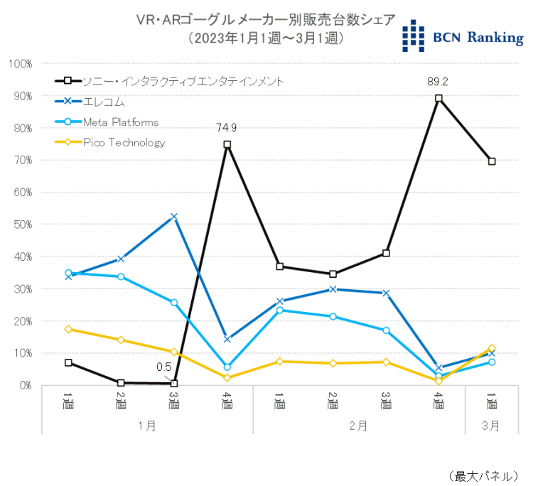 PlayStation 5(PS5)専用のPSVR2は、予約開始から好調なスタートを切った。予約を開始した1月26日を含む1月4週の時点でSIEは早くもシェア74.9%を記録。エレコム、Meta Platforms、Pico Technologyの3社をごぼう抜きして、20年6月22日週以来135週ぶりに首位を獲得した。その後は4割前後のシェアで推移していたが、発売日の2月22日を含む2月4週にシェアが再度急上昇。9割目前の89.2%に達した。