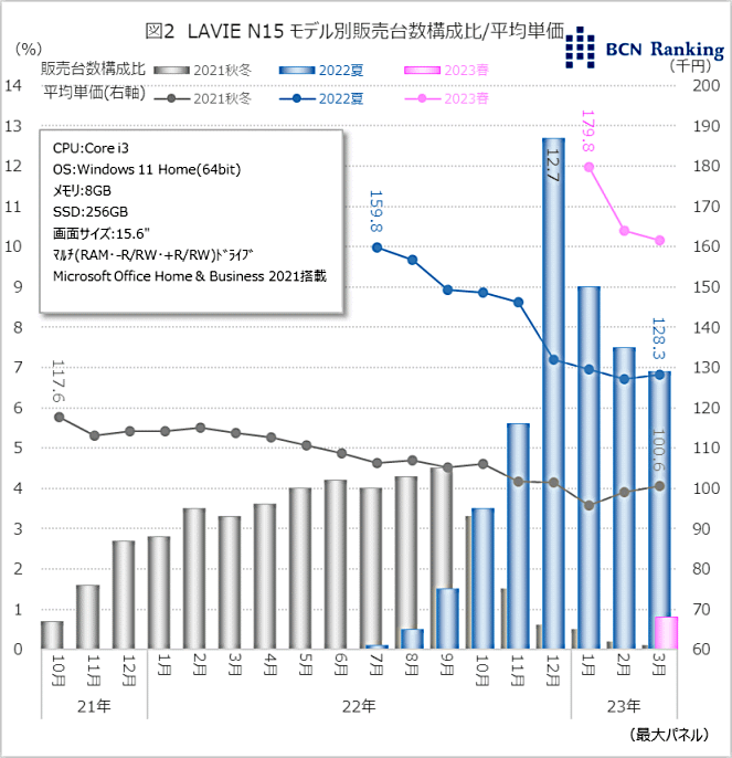 ただし、ノートPCの平均単価は、スペックの変化で変動する。例えば、Core i7やRyzen 7などハイスペックCPUを搭載した製品の構成比が増えると、必然的に平均単価も上昇する。そこで、機種別ランキングで上位に位置する、NECのLAVIE N15シリーズに焦点をあて、前後のモデルの平均単価と販売台数構成比の推移を調べた。