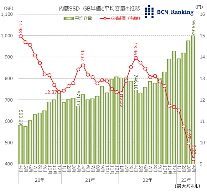 内蔵SSD市場において、1GBあたりの単価(以下、GB単価)の下落が止まらない。こうした動きを受けて平均容量は右肩上がりに推移、1TBに近づいていることが、家電量販店・ネットショップの実売データを集計する「BCNランキング」で明らかとなった。