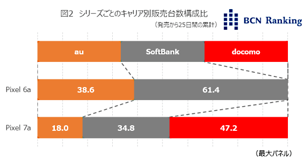 次に、発売25日間の各シリーズにおけるキャリアの構成比を算出した。Pixel 6aではauが38.6%、SoftBankは61.4%だった。一方、Pixel 7aではdocomoが半数に近い47.2%を占め、SoftBankは34.8%、auが18.0%という状況。今回のPixel 7aにおける出だしの好調さは、docomoが支えていると言ってよい。