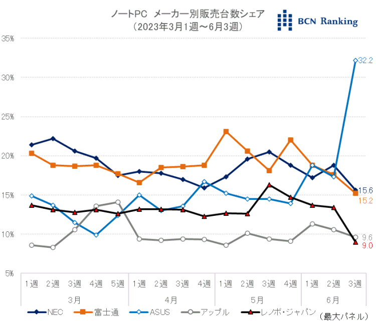 2023年6月3週のノートPC市場で、ASUSがメーカー別販売台数シェア首位に浮上した。シェアは32.2%と過去3年で初めて3割を突破。6月14日発売のポータブルゲーミングPC、ROG Allyが大きく貢献した。家電量販店・ネットショップの実売データを集計する「BCNランキング」から明らかになった。