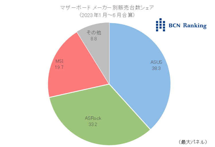 ASUSがマザーボード、グラフィックボードの2カテゴリで、2023年上半期(1月~6月の合算)のメーカー別販売台数シェアNo.1を獲得した。マザーボードの年間シェアでは首位が定位置の同社だが、今年の折り返し地点ではグラフィックボードでも首位を走っている。家電量販店・ネットショップの実売データを集計する「BCNランキング」で明らかになった。