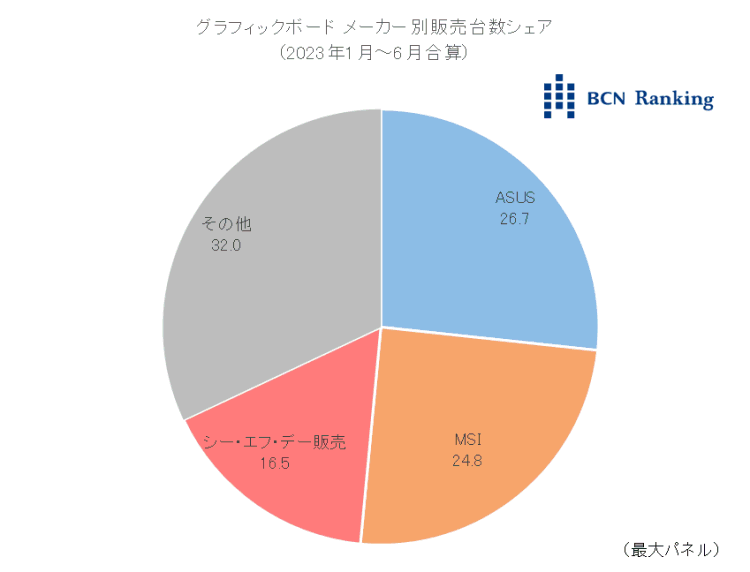 グラフィックボード市場でもASUSは26.7%のシェアで上半期No.1を獲得。2位のMSIを1.9ポイント上回った。年間シェアでは4年連続でMSIが首位を守っており、ASUSが年間でも首位を奪取できるかに注目だ。上半期No.1の原動力になったのは21年6月発売ながら現在も売れ筋の「DUAL-RTX3060-O12G-V2」。そのほか、23年1月発売の「TUF-RTX4070TI-12G-GAMING」や「DUAL-RTX3060TI-O8GD6X」といった新製品も貢献した。