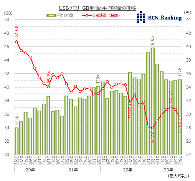 2023年6月のUSBメモリ市場において、1GBあたりの単価(以下、GB単価)は5月から引き続き下落していることが、家電量販店・ネットショップの実売データを集計する「BCNランキング」で明らかとなった。