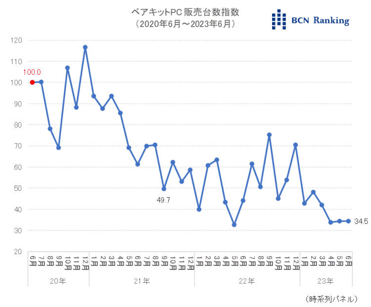 19年6月の販売台数を「100」とした指数は、21年に入ってから右肩下がりで推移。9月には「49.7」と半分にも満たない規模まで縮小した。22年も40~70前後と低調に推移。23年に入っても指数は回復せず、直近6月は「34.5」と、3年間で市場規模は6割以上縮小している。