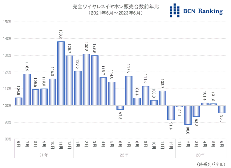 完全ワイヤレスイヤホン(TWS)市場の成長が鈍化している。2023年の月間販売台数は前年割れか前年並みにとどまっており、以前のような勢いが感じられない。家電量販店・ネットショップの実売データを集計する「BCNランキング」で明らかになった。