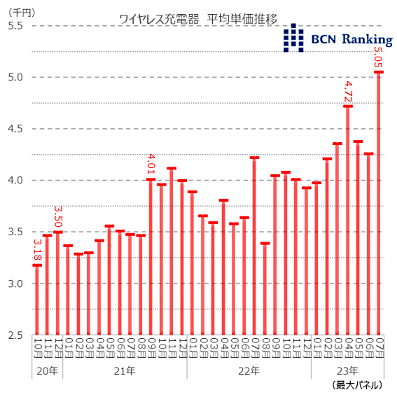 スマートフォン用の充電器市場において、ワイヤレス充電器の平均単価が約2年半で2千円強上昇していることが、家電量販店・ネットショップの実売データを集計する「BCNランキング」で明らかとなった。