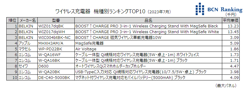 20年10月のワイヤレス充電器の平均単価は3.18千円だった。約一年後の21年9月に4千円を超える。しかしこれは一時的な動きで、その後は3千円台後半で推移。23年2月以降、恒常的に4千円台で推移し始めた。この平均単価上昇に大きく関わっているのが、BELKINの「BOOST↑CHARGE PRO 3-in-1 Wireless Charging Stand With MagSafe」だ。同製品の発売は22年6月だが、23年2月から販売数が上昇し始め、同年7月には機種別でブラックが1位、ホワイトが2位となっている。平均単価が1万円を超えており、3位以下の平均単価よりかなり高い。この製品は、iPhoneとApple Watch、AirPodsを同時に充電できることが支持されている要因と言えそうだ。