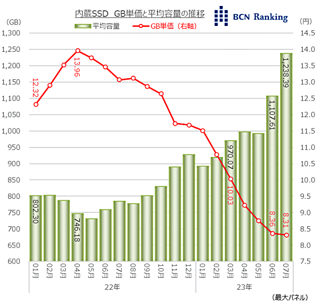 例年、内蔵SSDのGB単価は年末年始を底に上昇へと転じ、春過ぎに再び下落し始めるというサイクルで動いていた。しかし、22年末から現在に至るまで、GB単価は下落の一途をたどっていた。詳しくみていくと、22年1月の12.32円から4月の13.96円までGB単価は上昇していた。この動きに伴い、802.30GBから746.18GBまで平均容量は減少する。その後、例年通りGB単価下落フェーズに突入した。22年年末から23年年始にかけてもGB単価が上昇に転じなかったことで、大容量化が進行、6月にはついに1TBを超えた。GB単価は、23年に入ってから月を追うごとに1円近く下落していたが、6月は8.36円、7月は8.31円と下落は鈍化し、底を打ったとみられる。