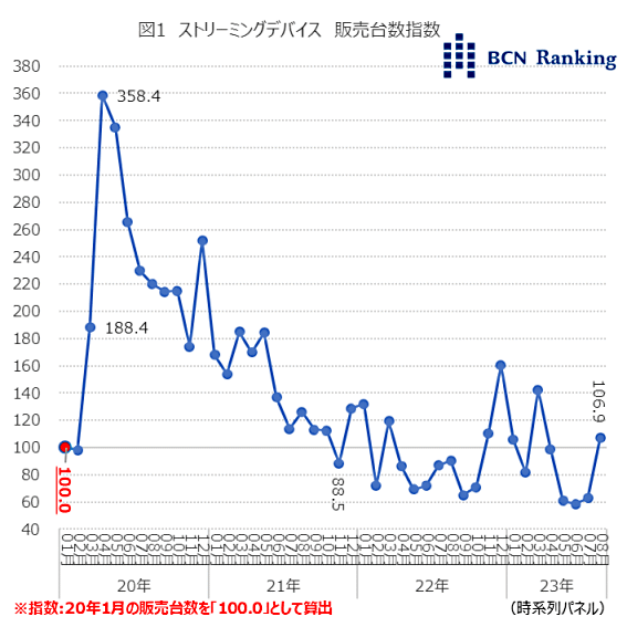 2020年1月の販売台数を「100.0」としたストリーミングデバイスの市場規模の推移をみていく。コロナの感染拡大により外出を控えるようになったことで、市場規模に変化があらわれた。20年2月は変化がなかったものの、その後月を追うごとに規模は急拡大し、同年4月には358.4まで達した。需要が一巡すると緩やかに指数は減少していくが、21年11月まで100を上回る水準で推移した。その後は基点を下回る月が多かったが、23年8月は106.9と5か月ぶりに基点を上回った。
