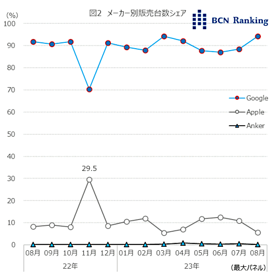 メーカーシェアではGoogleが9割を占め、市場をけん引している。Appleは1割を若干下回る水準が続いている。22年11月は「Apple TV 4K(第3世代)」の発売により3割程までシェアを増加させるも、瞬間風速的な盛り上がりにとどまった。また、Ankerの「Nebula 4K Streaming Dongle」は1%に満たない値で推移している。