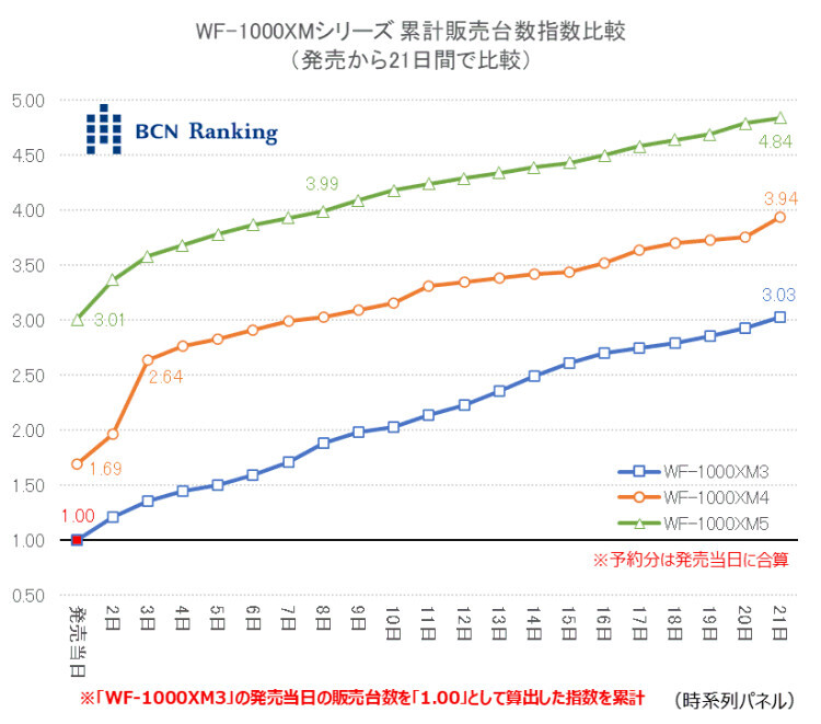19年7月に発売した「XM3」の発売当日の販売数を「1.00」として、21年6月に発売した「XM4」、この9月に発売した「XM5」の計3シリーズの発売直後21日間の累計販売数指数を比較した。「XM3」は発売当日から堅調に販売台数を伸ばし累計は3.03だった。「XM4」は、発売当日から前作を上回る1.69を記録。3日目までで2.64に達する鋭い立ち上がりを見せた。その後の上がり幅は緩やかになり、累計販売数指数は3.94になった。最新作「XM5」は初日からXM3の約3倍の3.01を記録するロケットスタートを切った。8日目では過去2作の21日間の累計販売台数指数を上回る「3.99」に到達。最終的に累計販売数指数は「4.84」になった。