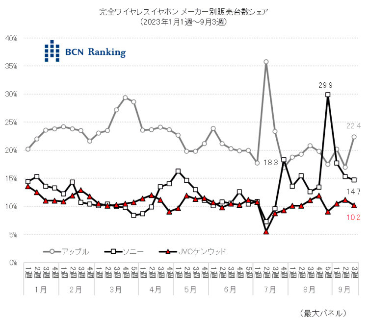 XM5の発売はソニーのメーカー別販売数シェアを大きく押し上げた。XM5の予約開始日を含む7月4週のシェアは、前週から8.7ポイント増加の18.3%にジャンプアップ。アップルを逆転し、52週ぶりで首位に立った。さらに、発売日の9月1日を含む8月5週には再びシェアが急増。ソニーにとって今年最高の29.9%を記録した。